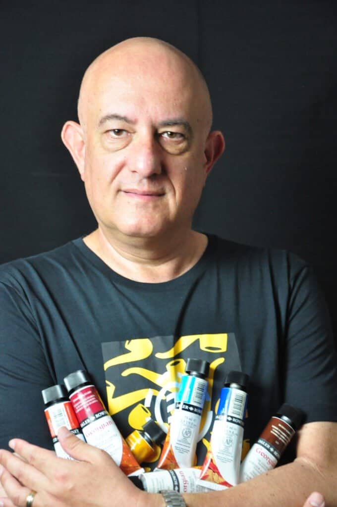 המברשות, המריתים שבהן אני משתמש והבד", מסביר חביב