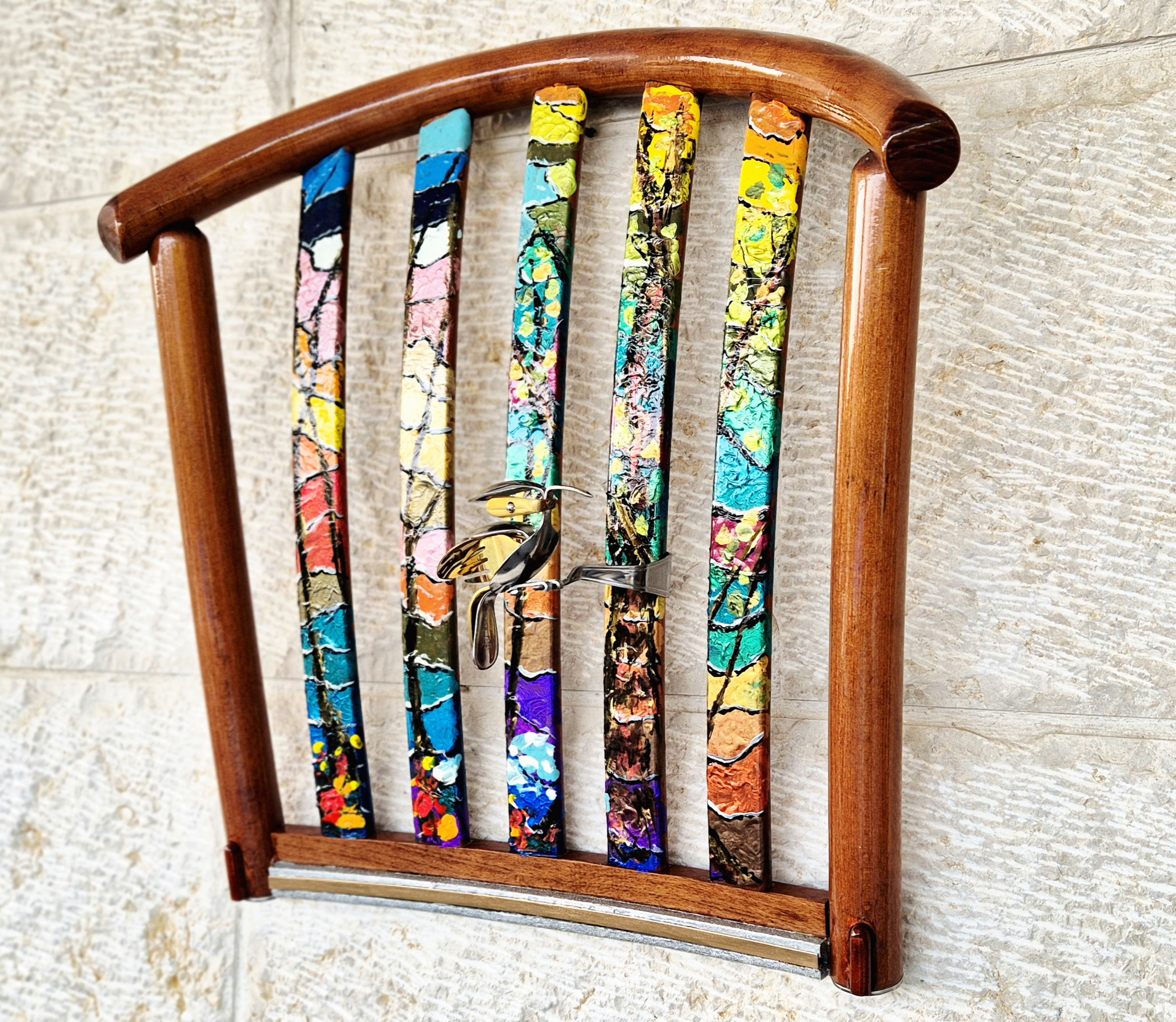 פסל קיר, שילוב עץ ומתכת, צבע אקרילי.